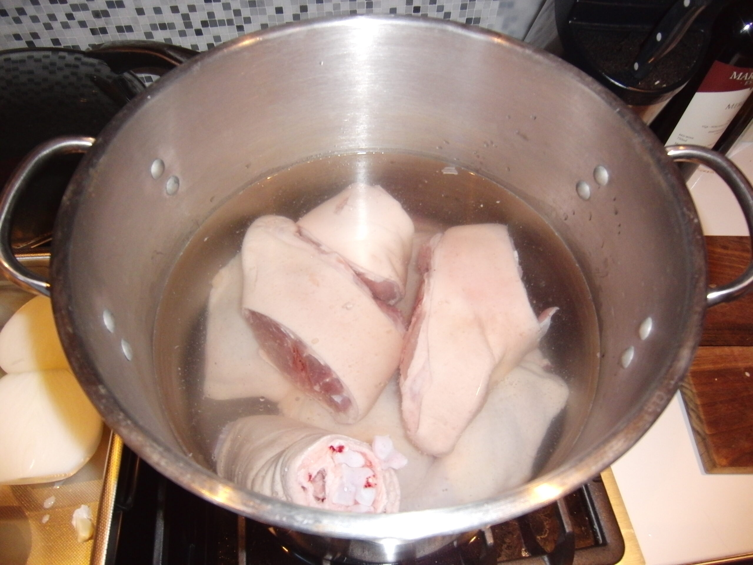 So the recipe actually calls for pig trotters. Pork bones are also good. I used pig hocks. First they have way to much meat on them. You want to be making a broth, not a stew.